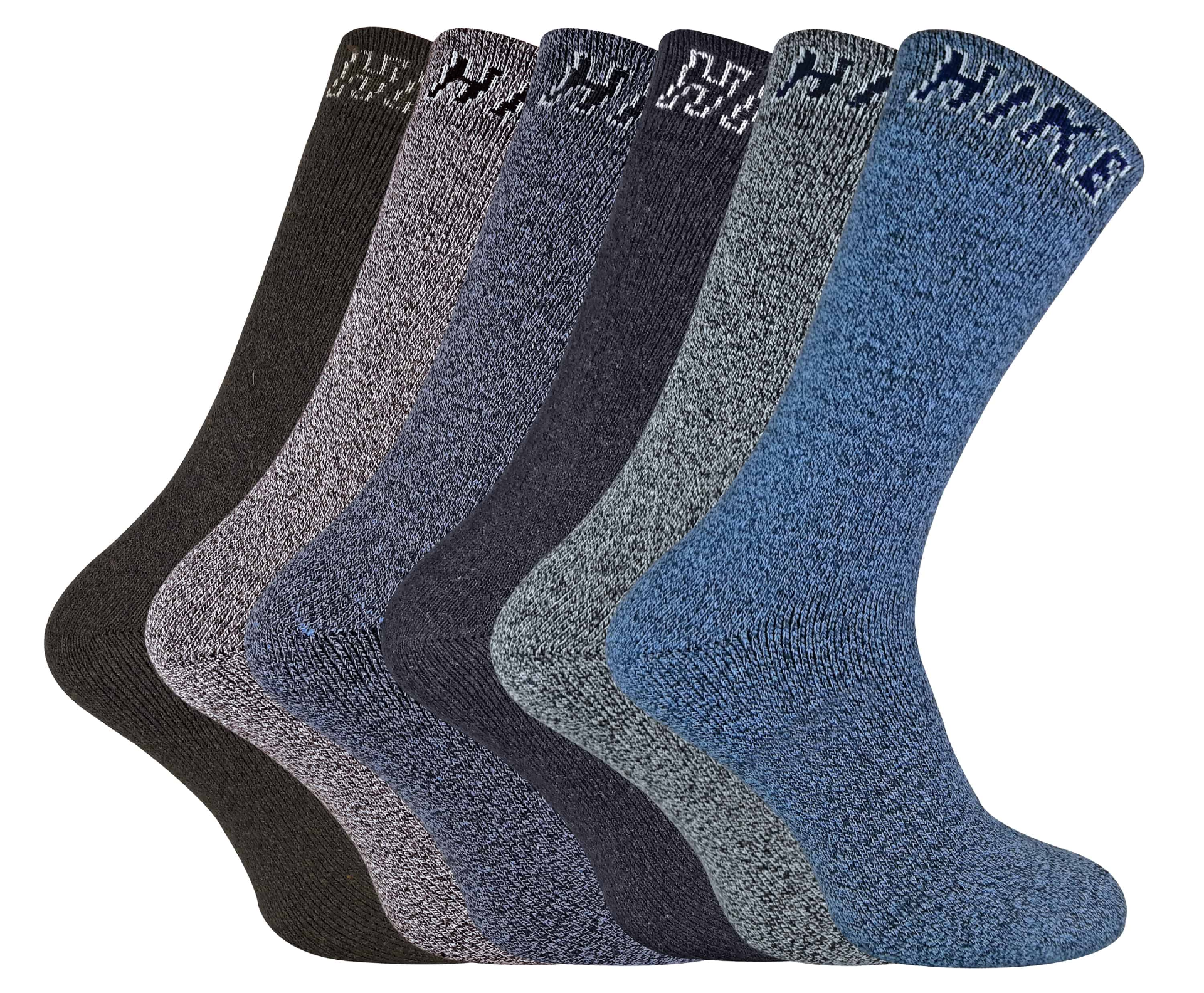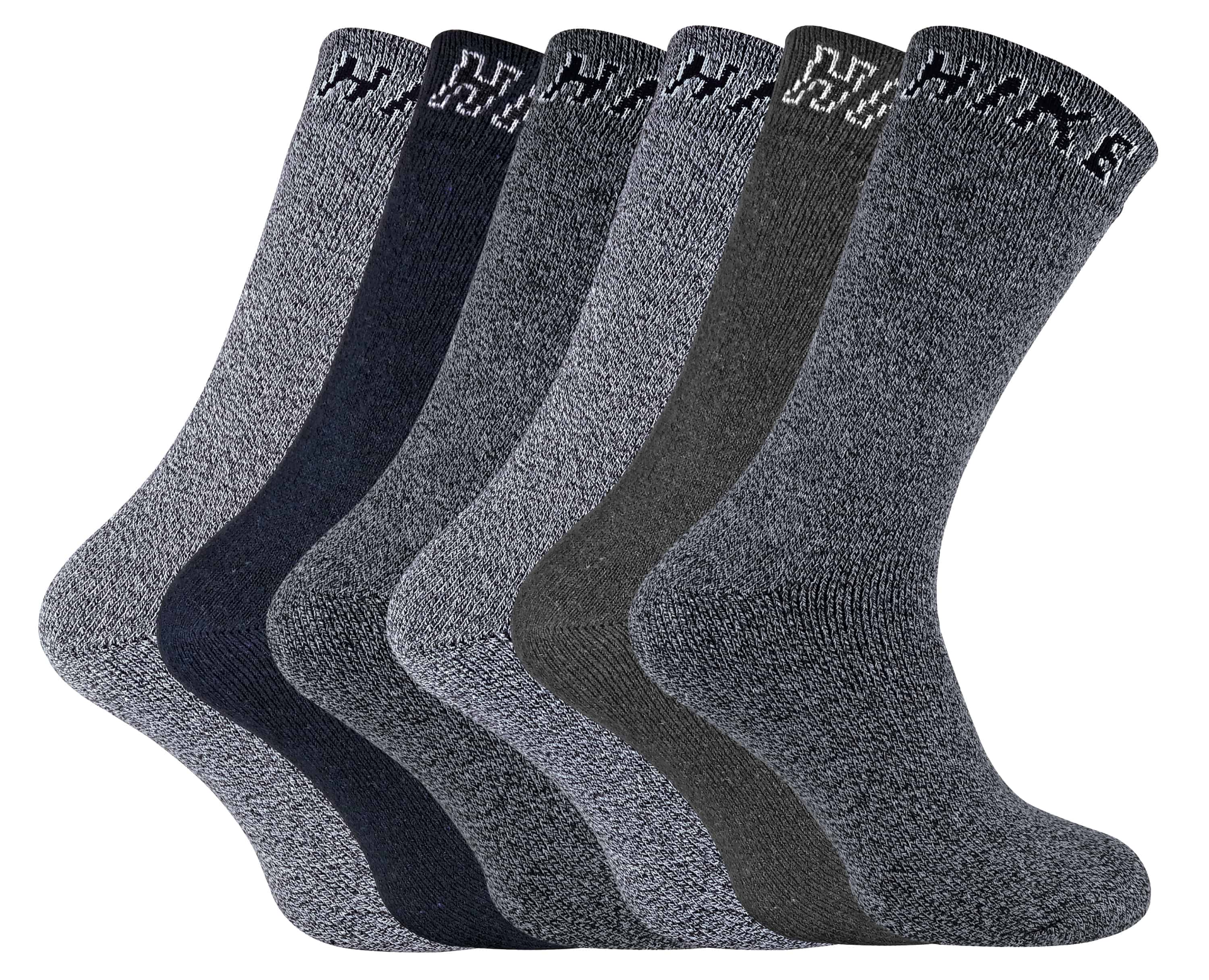These socks are available in 2 Variations including grey assortments and blue assortments. They are available in sizes 6-11 UK / 39-45 EU / 7-12 US and are made from 63% Cotton, 34% Polyester, 2% Nylon, 1% Elastane. They come in a Pack Size of 6 and are Machine Washable.